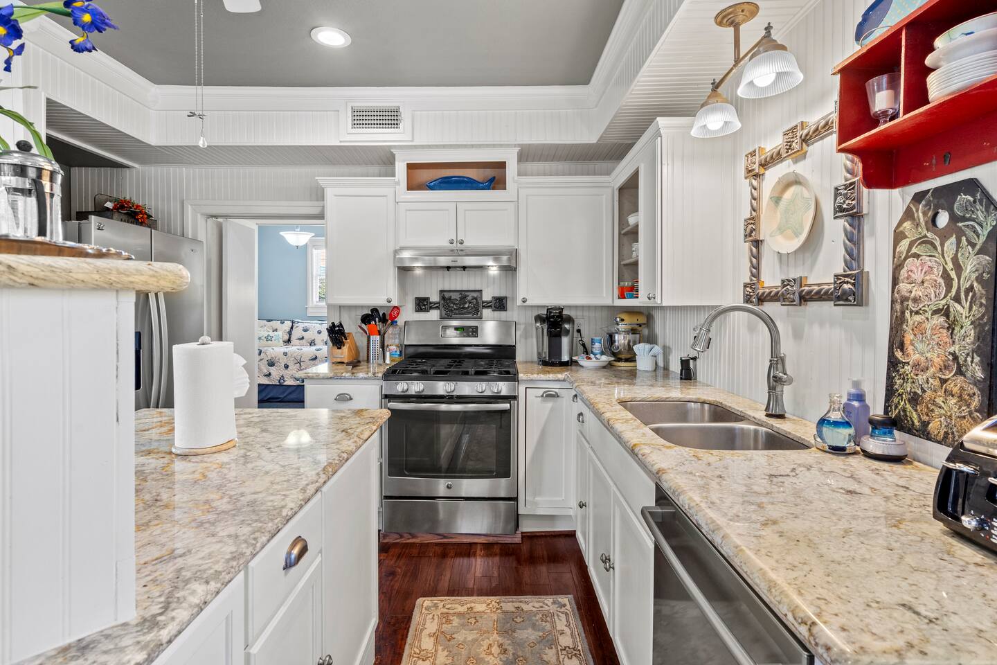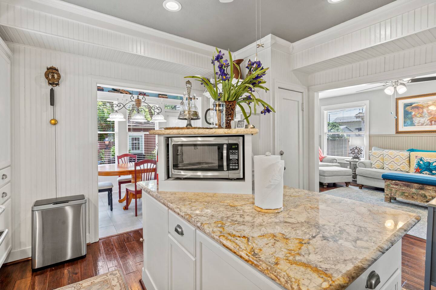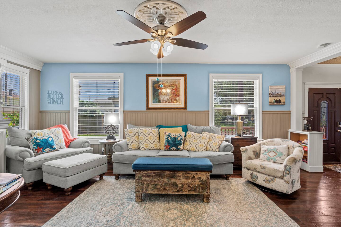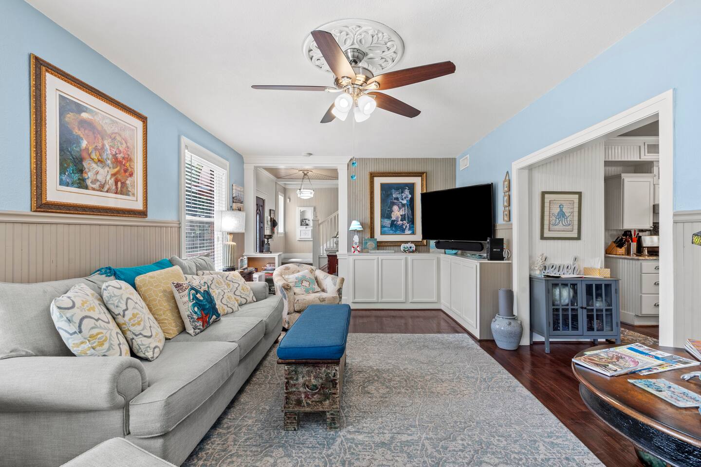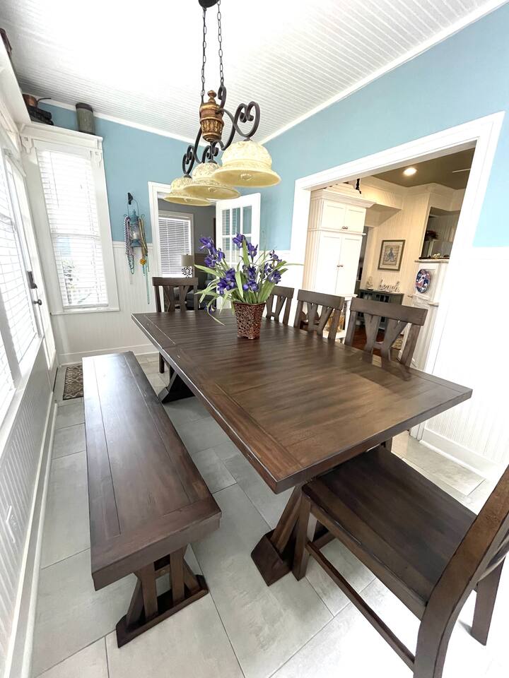 1928 Kempner Retreat Perfectly located in mid-town Galveston, this beautifully restored home blends historic character with modern comfort. You’ll be just: 3 minutes to the Seawall & beach 7 minutes to the Cruise Ship Terminal Close to Galveston’s popular restaurants & attractions Whether you're here for a beach getaway, cruise departure, or a relaxing island weekend, the location truly can’t be beat. Location Highlights This mid-town location gives you easy access to: Galveston Seawall beaches Cruise terminals Historic downtown Restaurants & shops Thoughtfully equipped to deliver a comfortable, stress-free 5-star stay. Spacious 3 bed / 3 bath layout Sleeping Arrangements (Sleeps 7 in Beds + 2 on Air Mattress) Perfect for families or small groups who want both privacy and space. Primary Suite: King bed with ensuite full bathroom/walk-in shower Bedroom Two: Queen bed Access to full bath with tub/shower combo Bedroom Three: Queen bed Ensuite full bathroom with shower Loft Area Twin-size daybed (great for kids or flexible sleeping) Additional Sleeping Queen air mattress (sleeps up to 2) This flexible layout makes it easy for couples, families, and cruise groups to spread out comfortably. Living & Gathering Spaces: Large family room with Smart TV Dedicated dining room Open island kitchen fully stocked for cooking meals together Great flow for relaxing after a beach day or gathering before a cruise departure. Full laundry room Starter supplies provided: Toilet paper Paper towels Coffee & creamer Shampoo Conditioner Soap Everything you need to settle in comfortably.