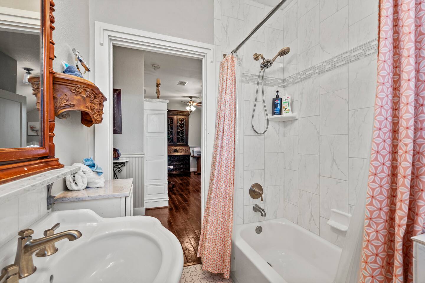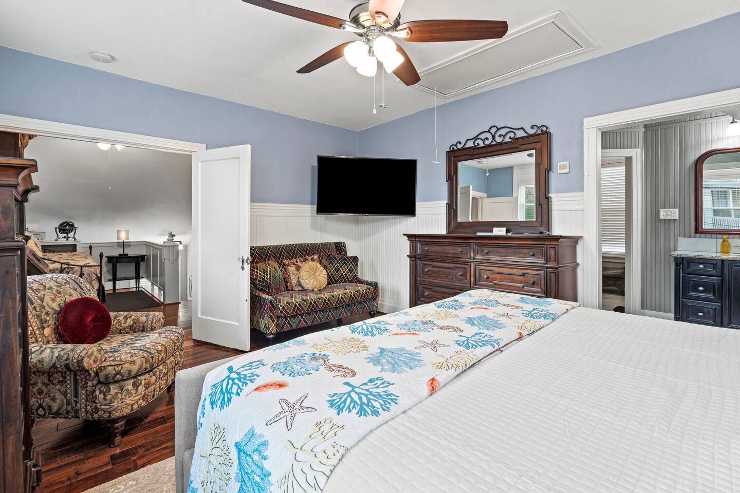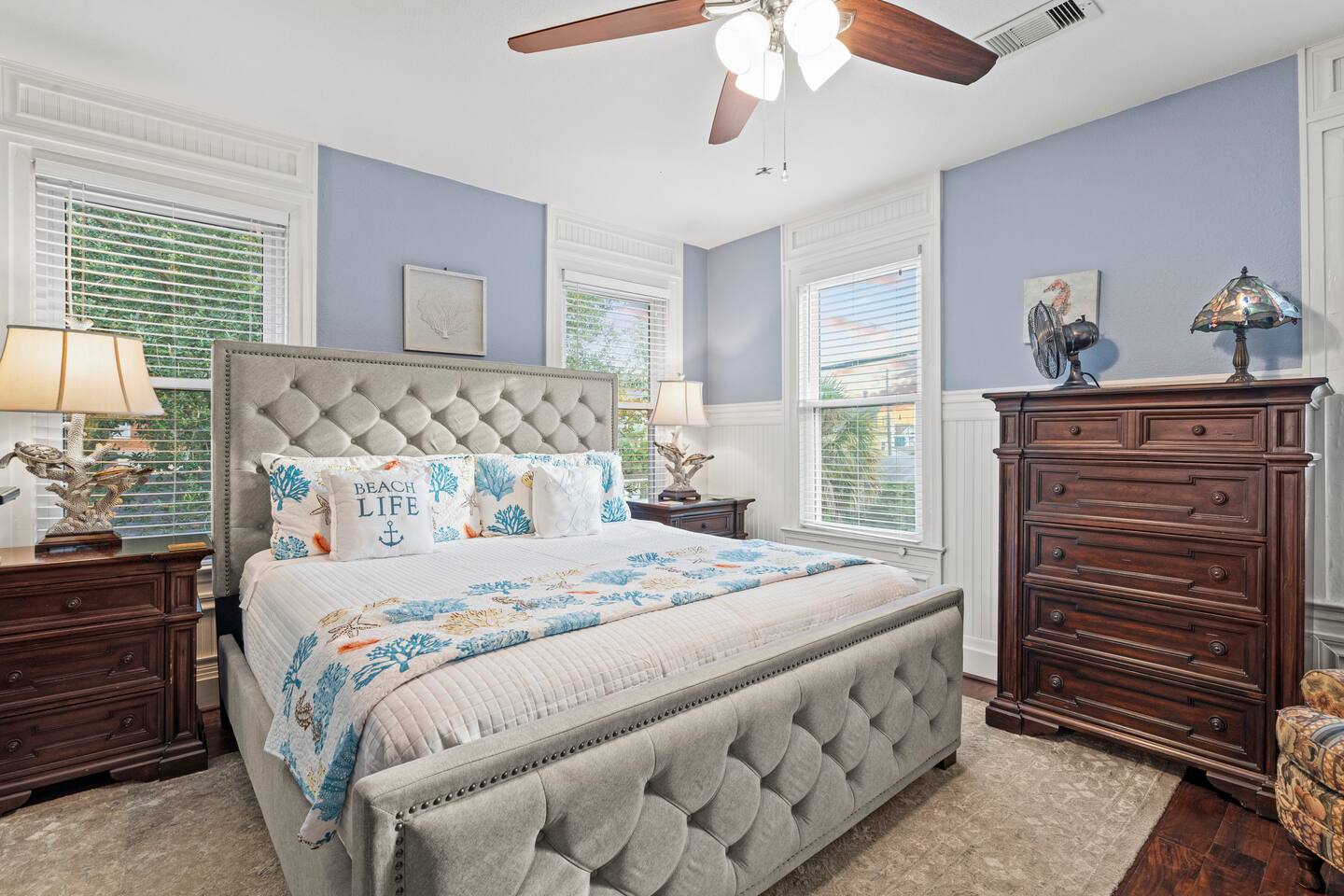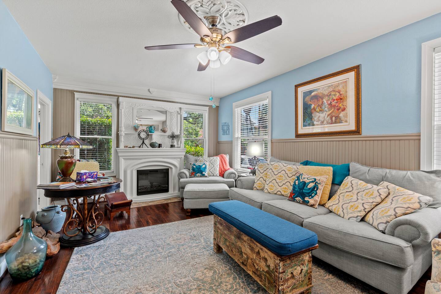 1928 Kempner Retreat Perfectly located in mid-town Galveston, this beautifully restored home blends historic character with modern comfort. You’ll be just: 3 minutes to the Seawall & beach 7 minutes to the Cruise Ship Terminal Close to Galveston’s popular restaurants & attractions Whether you're here for a beach getaway, cruise departure, or a relaxing island weekend, the location truly can’t be beat. Location Highlights This mid-town location gives you easy access to: Galveston Seawall beaches Cruise terminals Historic downtown Restaurants & shops Thoughtfully equipped to deliver a comfortable, stress-free 5-star stay. Spacious 3 bed / 3 bath layout Sleeping Arrangements (Sleeps 7 in Beds + 2 on Air Mattress) Perfect for families or small groups who want both privacy and space. Primary Suite: King bed with ensuite full bathroom/walk-in shower Bedroom Two: Queen bed Access to full bath with tub/shower combo Bedroom Three: Queen bed Ensuite full bathroom with shower Loft Area Twin-size daybed (great for kids or flexible sleeping) Additional Sleeping Queen air mattress (sleeps up to 2) This flexible layout makes it easy for couples, families, and cruise groups to spread out comfortably. Living & Gathering Spaces: Large family room with Smart TV Dedicated dining room Open island kitchen fully stocked for cooking meals together Great flow for relaxing after a beach day or gathering before a cruise departure. Full laundry room Starter supplies provided: Toilet paper Paper towels Coffee & creamer Shampoo Conditioner Soap Everything you need to settle in comfortably.