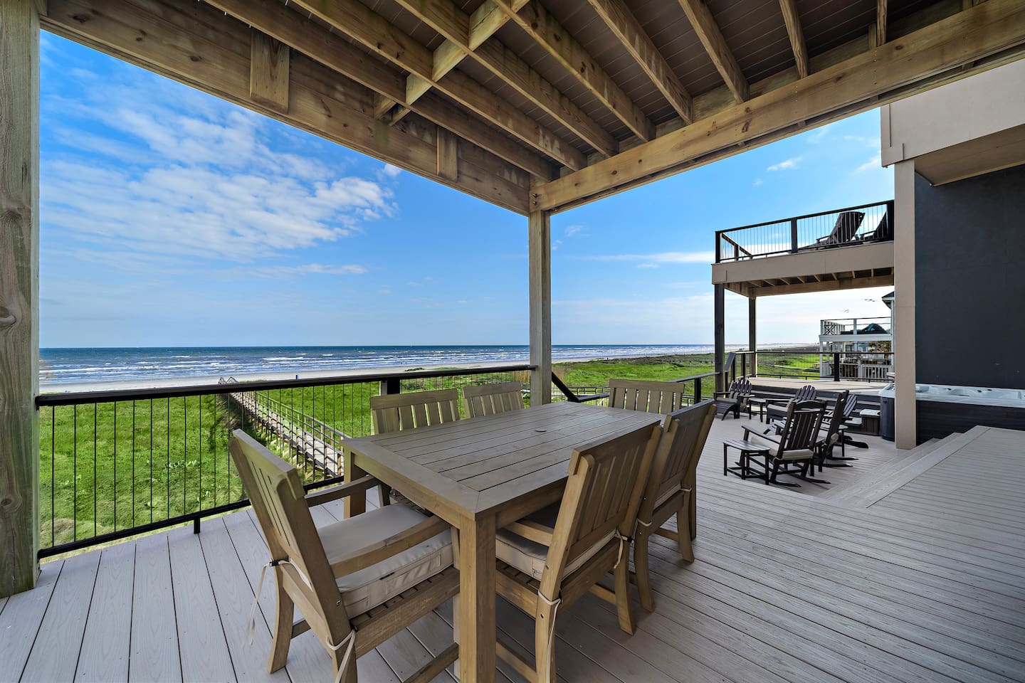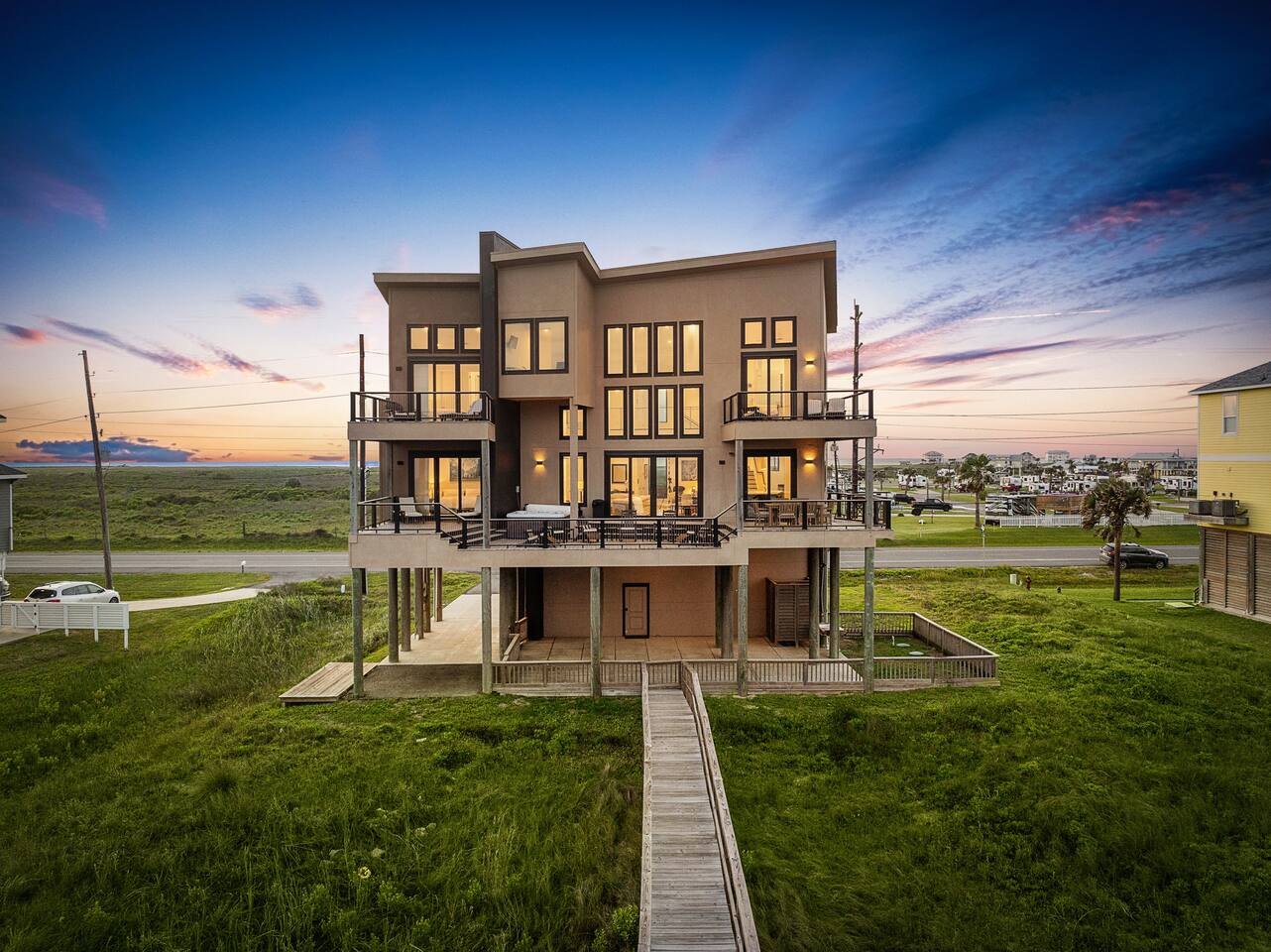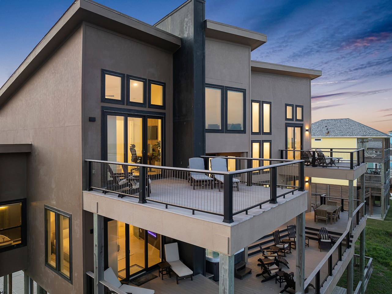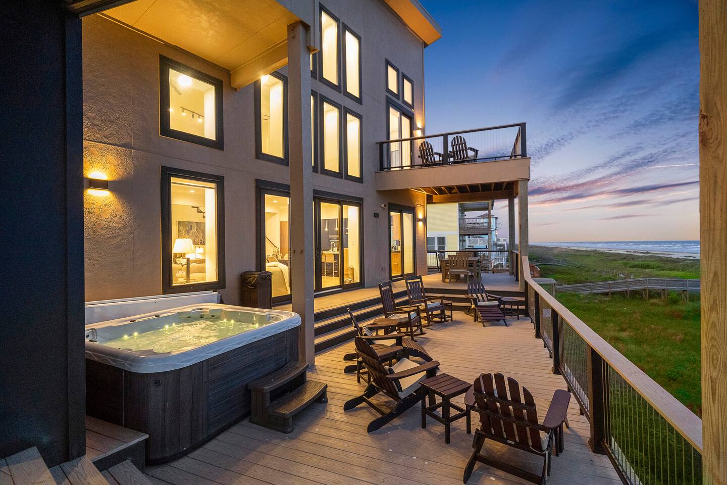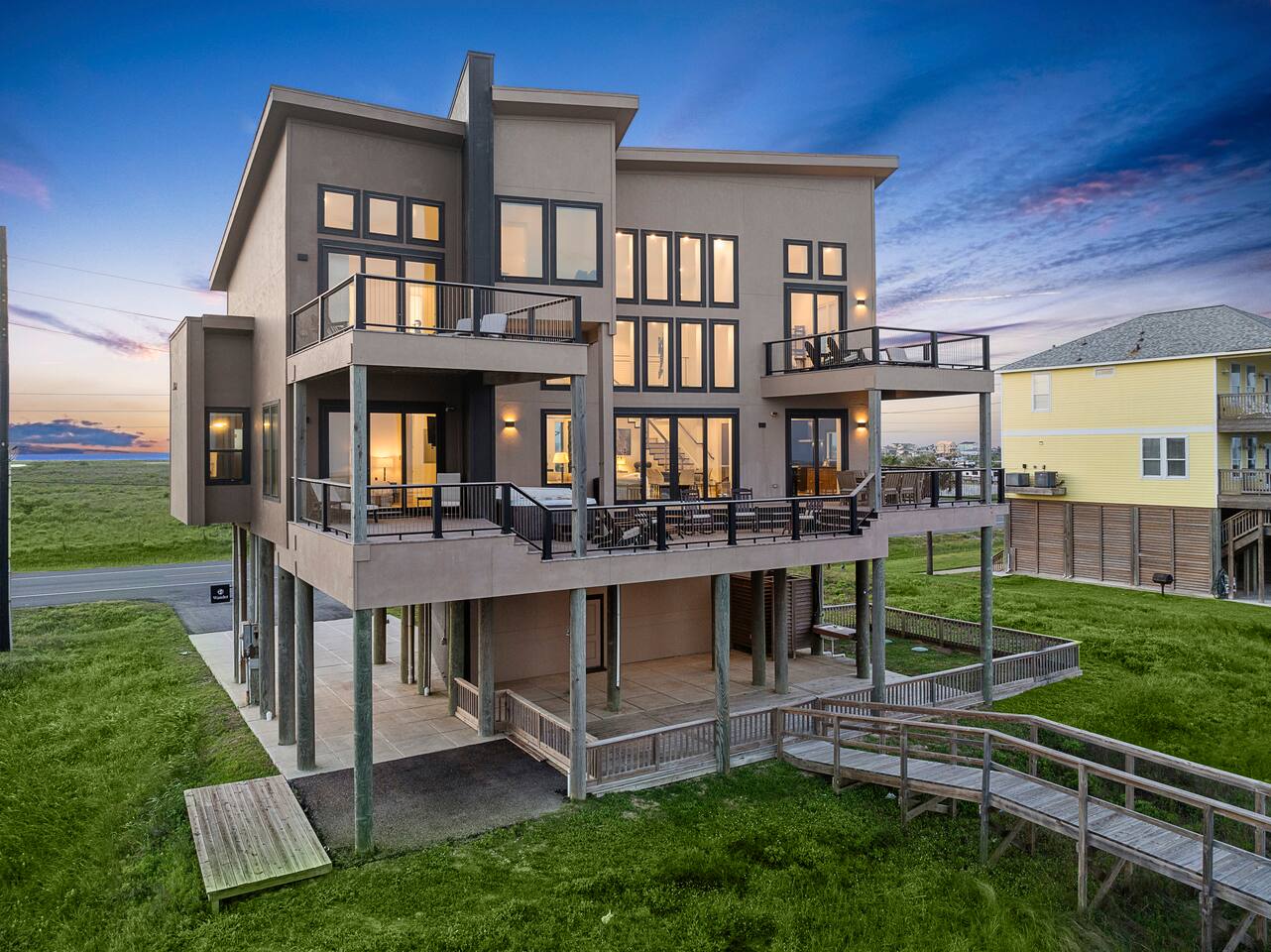 Experience luxury beachfront living in this modern 3,200 sq ft oceanfront retreat on the quiet west end of Galveston Island. Featuring 3 private bedroom suites with en-suite baths and private decks, plus a loft, this home is perfect for relaxing coastal getaways. Enjoy premium amenities including a hot tub, spa-style steam shower, high-end Miele appliances, and smart TVs throughout. Seasonal vehicle restrictions create a peaceful, secluded beach escape.