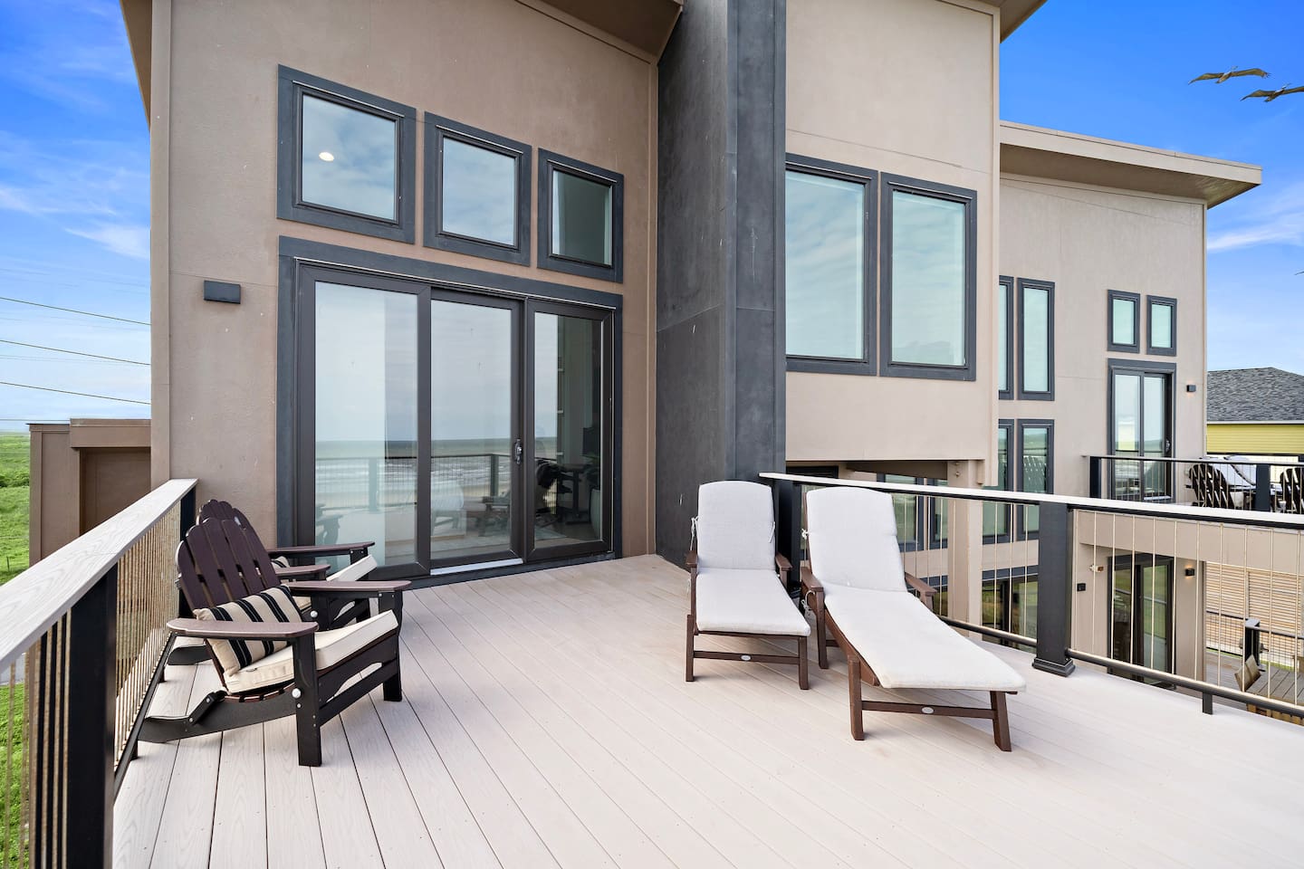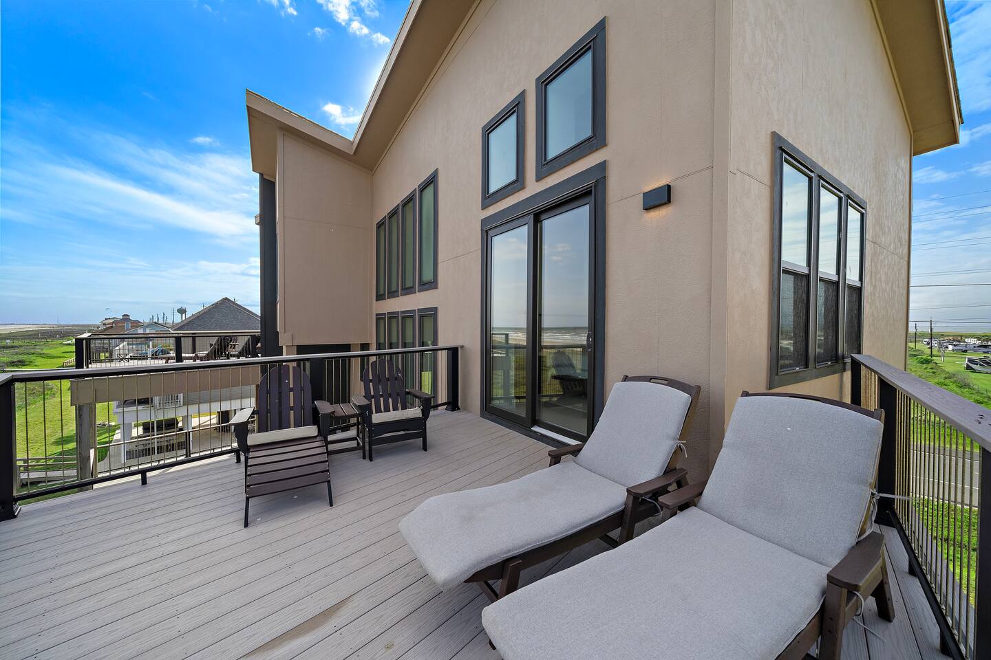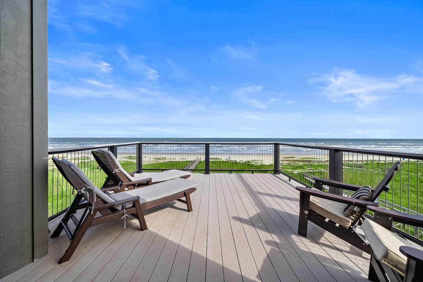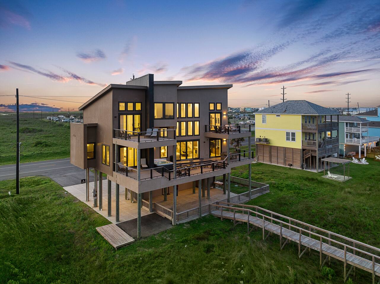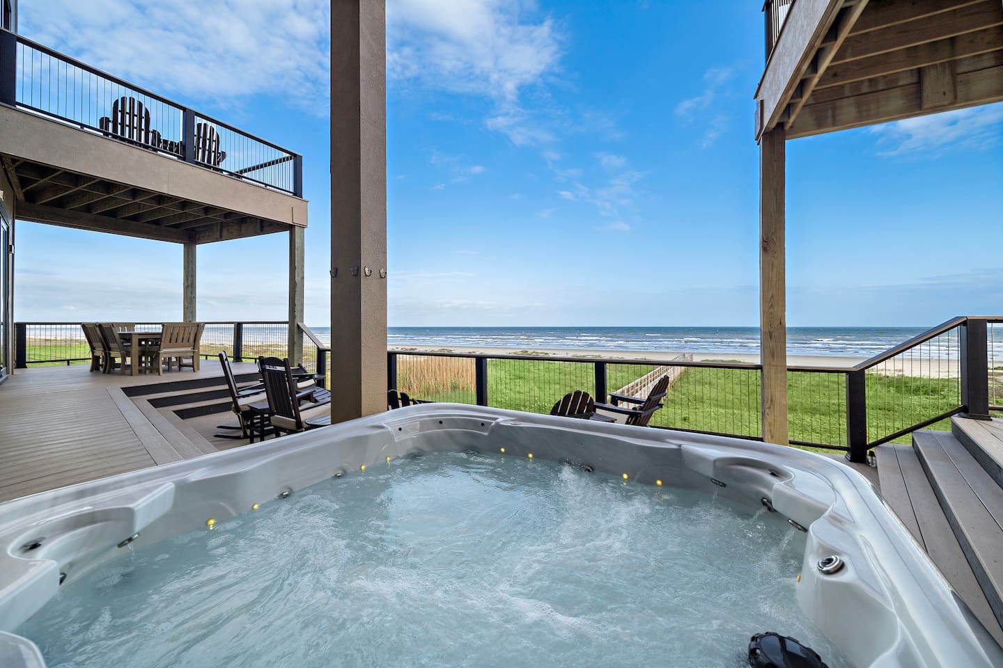 Experience luxury beachfront living in this modern 3,200 sq ft oceanfront retreat on the quiet west end of Galveston Island. Featuring 3 private bedroom suites with en-suite baths and private decks, plus a loft, this home is perfect for relaxing coastal getaways. Enjoy premium amenities including a hot tub, spa-style steam shower, high-end Miele appliances, and smart TVs throughout. Seasonal vehicle restrictions create a peaceful, secluded beach escape.