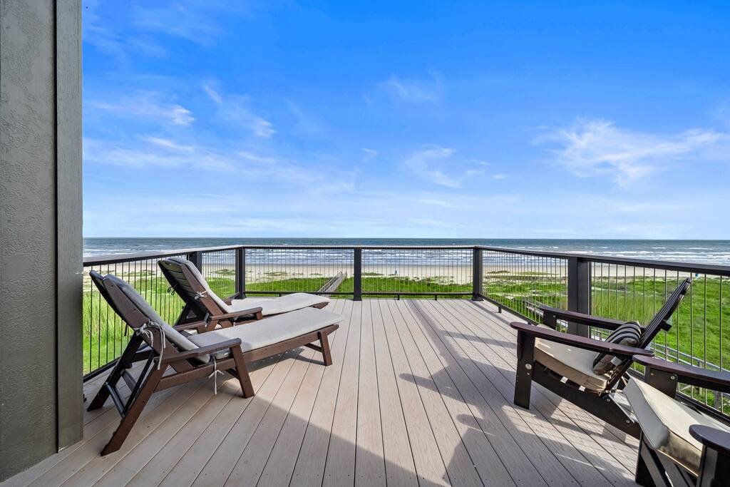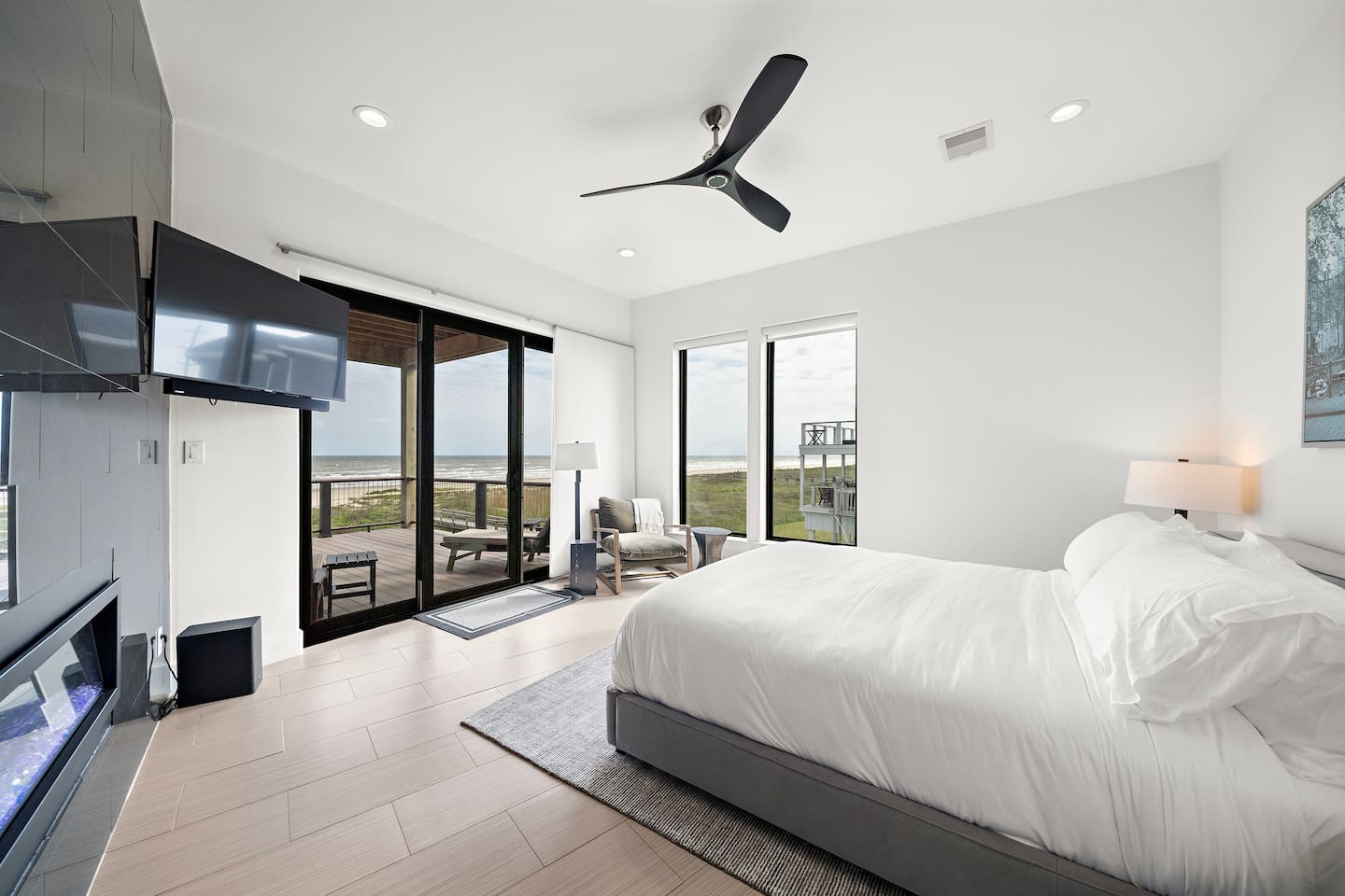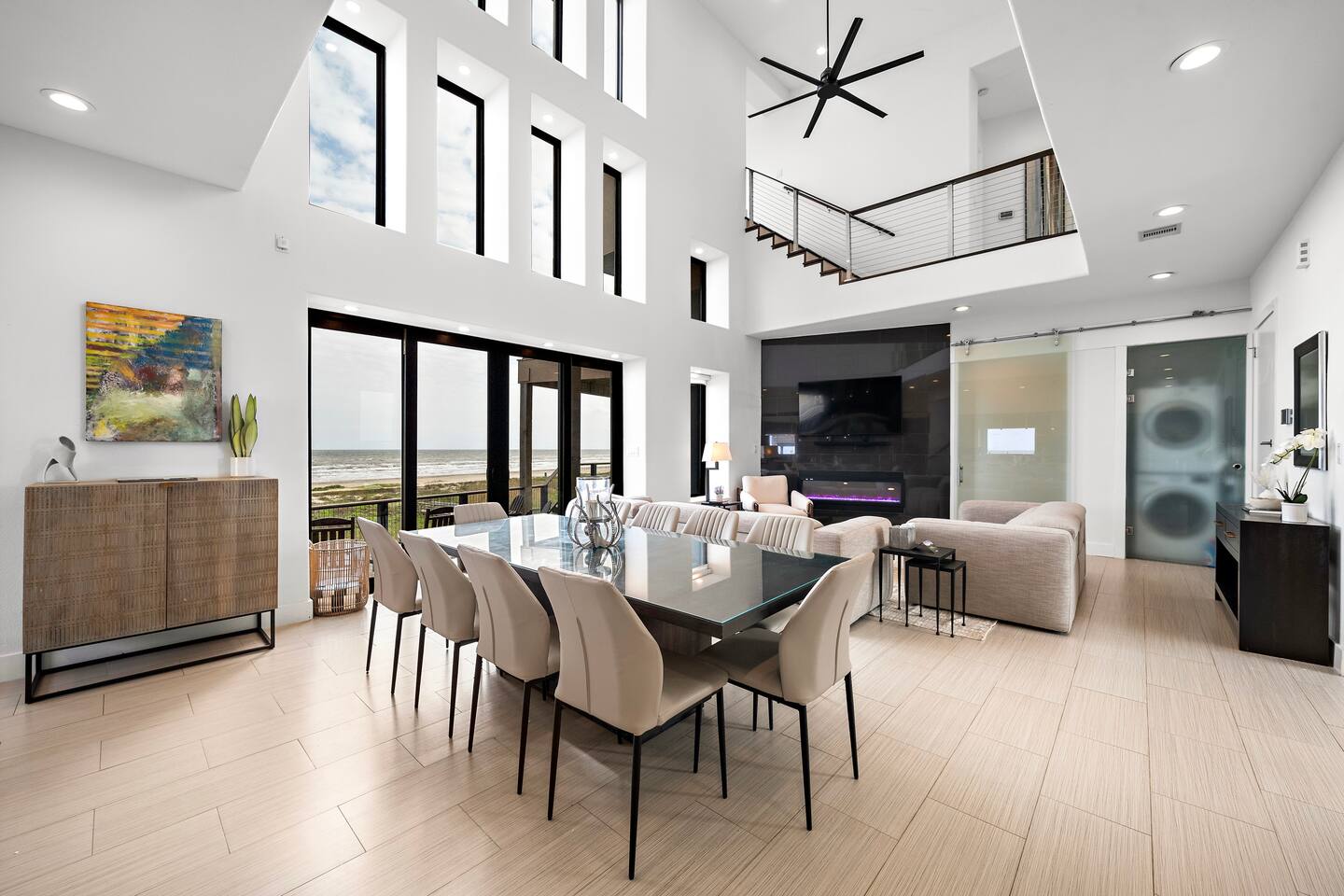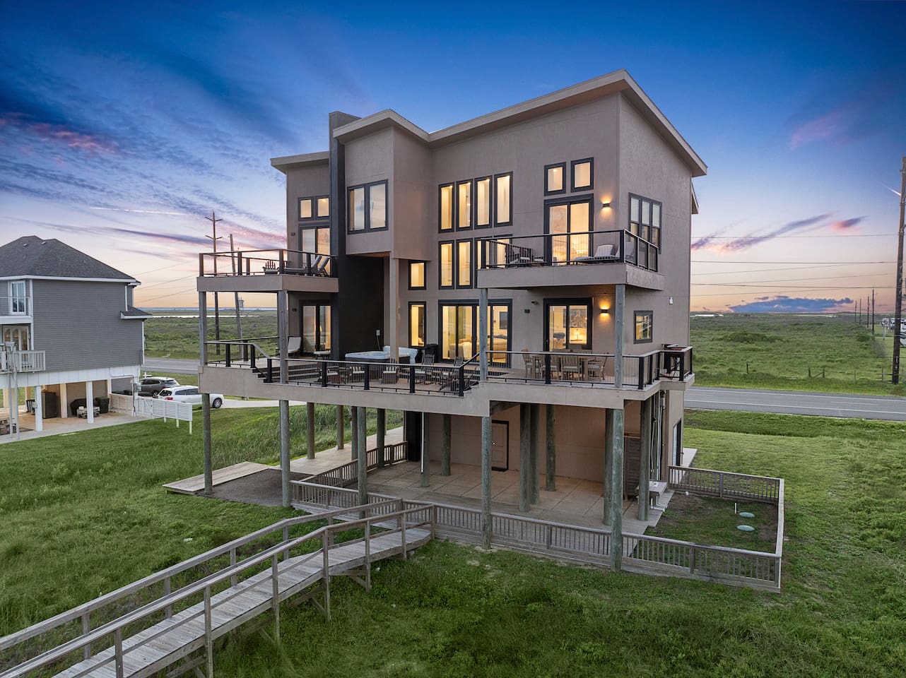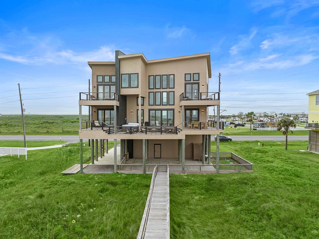Experience luxury beachfront living in this modern 3,200 sq ft oceanfront retreat on the quiet west end of Galveston Island. Featuring 3 private bedroom suites with en-suite baths and private decks, plus a loft, this home is perfect for relaxing coastal getaways. Enjoy premium amenities including a hot tub, spa-style steam shower, high-end Miele appliances, and smart TVs throughout. Seasonal vehicle restrictions create a peaceful, secluded beach escape.