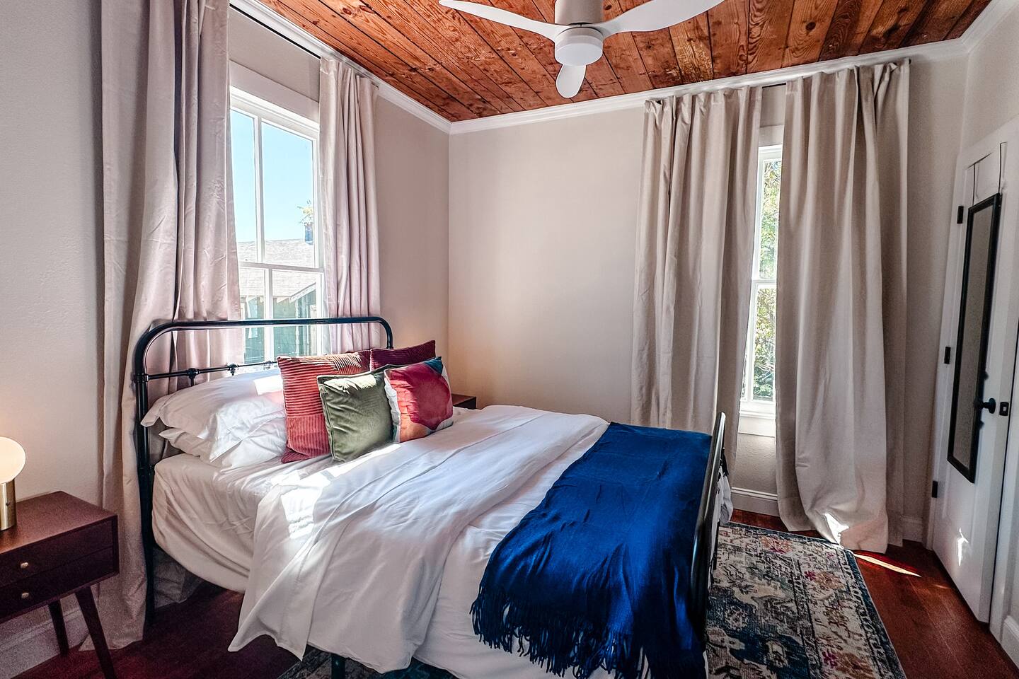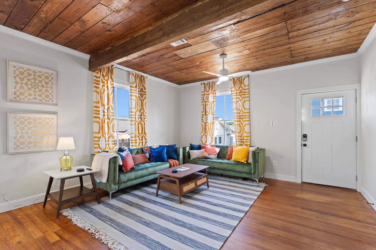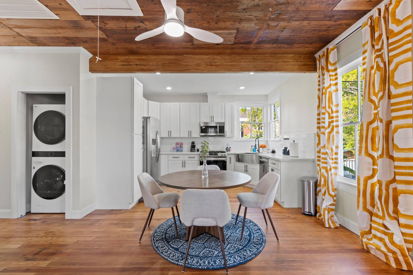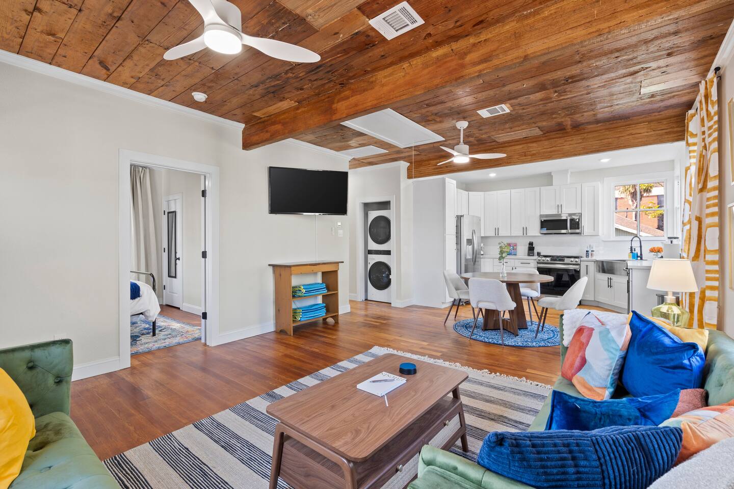 Step inside and discover a space where historic charm meets modern luxury. The bright, airy interior features original hardwood floors, shiplap walls, and a striking natural wood plank ceiling, creating a warm and welcoming atmosphere. The open-plan living area, decorated with vibrant green velvet sofas, is the perfect place to relax after a day of exploring. This home is thoughtfully designed for work, relocation, or an extended beach escape. Sleeping Arrangements Primary Bedroom: Features a comfortable Queen bed and a private ensuite bathroom. Second Bedroom: Offers a cozy Queen bed with easy access to the full hall bathroom. Living Room: A Queen air mattress is available for additional guests. Kitchen & Conveniences Prepare meals with ease in the fully stocked kitchen, complete with modern stainless-steel appliances and crisp white cabinetry. For your convenience, the guesthouse also includes: Fast Wi-Fi for remote work or streaming In-unit washer and dryer Central heating and air conditioning