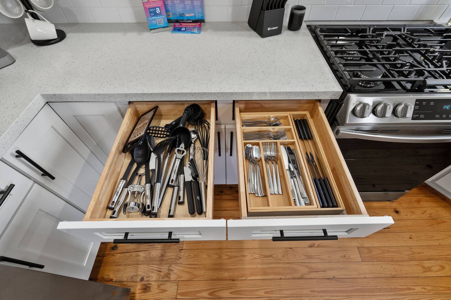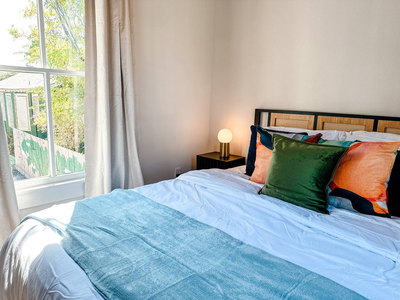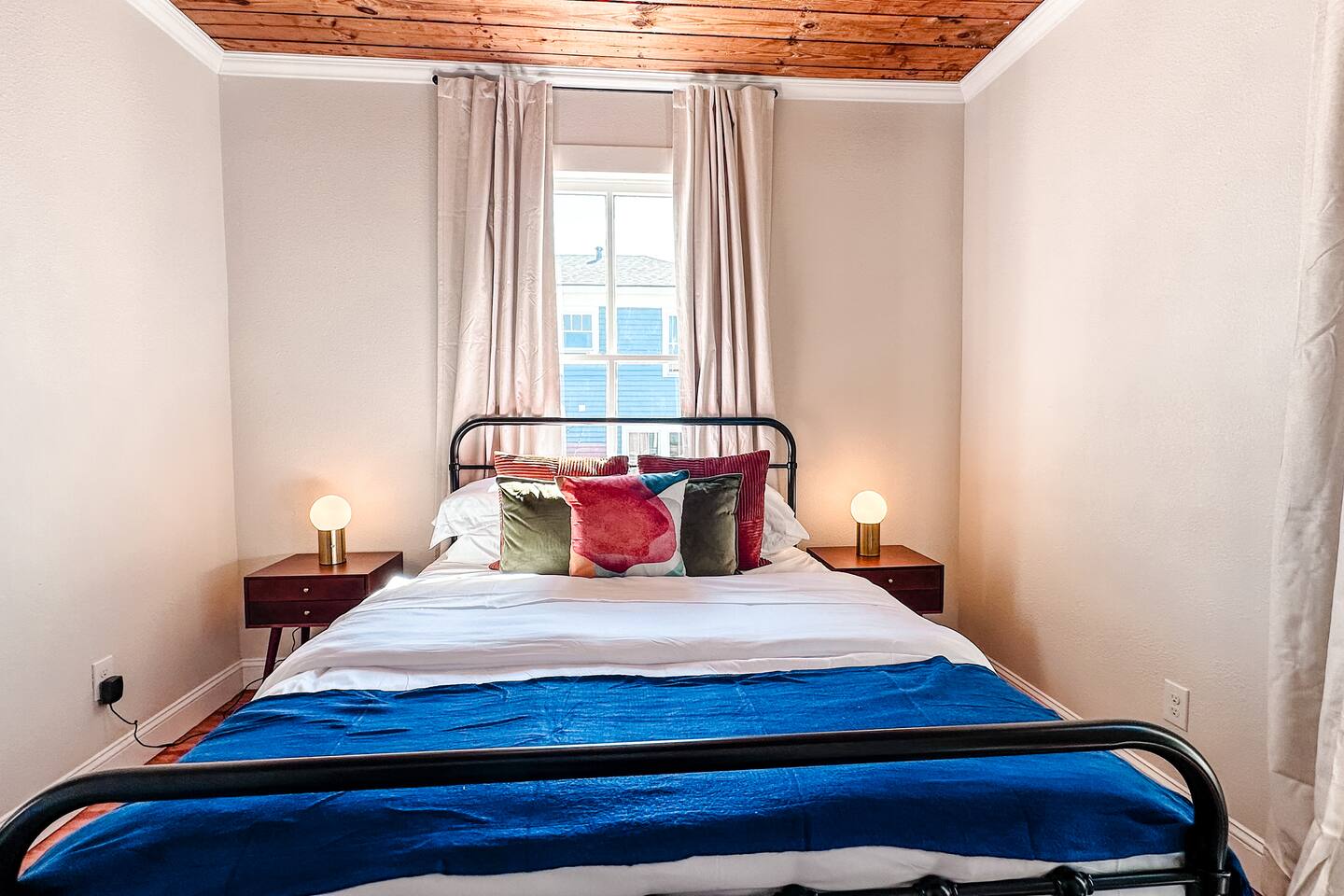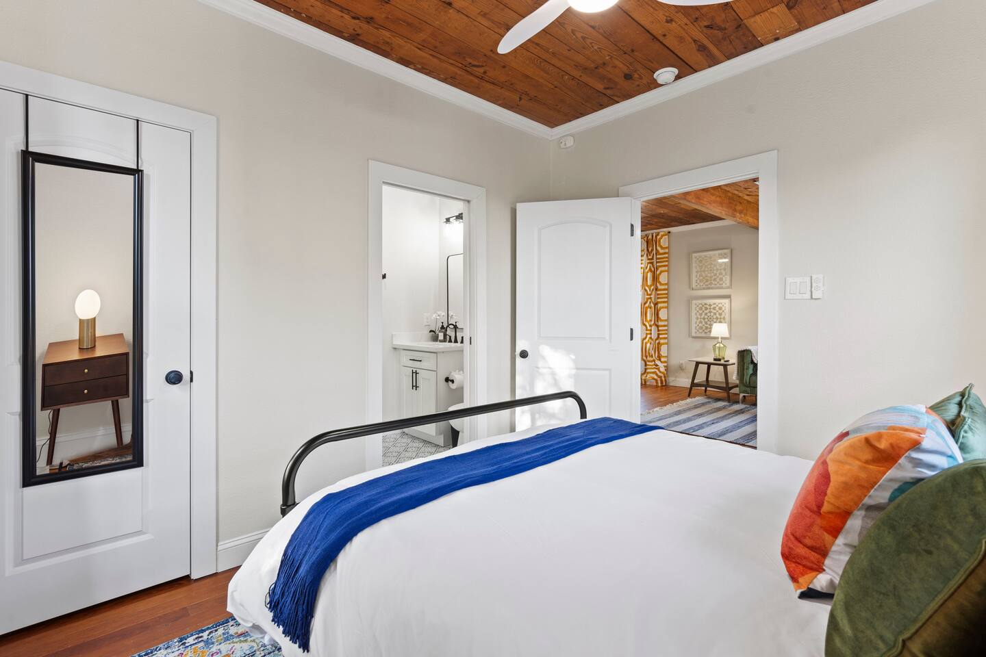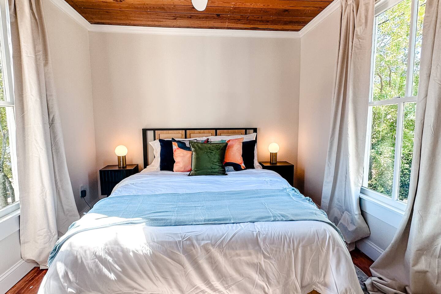 Step inside and discover a space where historic charm meets modern luxury. The bright, airy interior features original hardwood floors, shiplap walls, and a striking natural wood plank ceiling, creating a warm and welcoming atmosphere. The open-plan living area, decorated with vibrant green velvet sofas, is the perfect place to relax after a day of exploring. This home is thoughtfully designed for work, relocation, or an extended beach escape. Sleeping Arrangements Primary Bedroom: Features a comfortable Queen bed and a private ensuite bathroom. Second Bedroom: Offers a cozy Queen bed with easy access to the full hall bathroom. Living Room: A Queen air mattress is available for additional guests. Kitchen & Conveniences Prepare meals with ease in the fully stocked kitchen, complete with modern stainless-steel appliances and crisp white cabinetry. For your convenience, the guesthouse also includes: Fast Wi-Fi for remote work or streaming In-unit washer and dryer Central heating and air conditioning